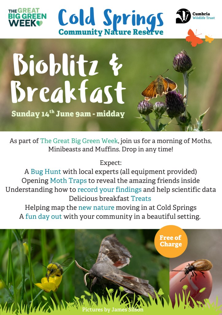 As part of Penrith’s Great Big Green Week, Cumbria Wildlife Trust invites you to Cold Springs for a brilliant morning of Moths, Minibeasts, and Muffins!